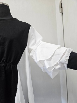 Size F ドッキングベストブラウスは重ね着風ボリュームスリーブとなっております。 シンプルなボトムスとの相性抜群、スキニーパンツで甘辛クールビューティー、スカートと合わせてゆるふわフェミニンガーリー、気分によって色んなコーデが楽しめます。